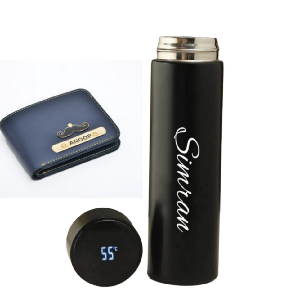 Wallet & temperature Bottle Combo hot & Cool Bottle This combo package not only features a temperature-controlled bottle, but it also comes with a unique touch bottle that can be personalized with your name. The temperature bottle is designed to keep your beverages at the perfect temperature, whether you prefer them hot or cold. It's an excellent choice for those who are always on the go or want to enjoy their drinks without worrying about them getting lukewarm or losing their freshness. WALLET- A unique wallet that reflects your personality! With all of your tiniest, most valuable personal and financial belongings securely stored in this wallet, you'll be stylishly well-organized. A full-length cash compartment and multiple credit card slots are all included in this smooth, rich, supple, and opulent wallet. It's ideal for holding receipts, and its unique form makes it easy to slip into any pocket. This wallet is made of high-quality materials.